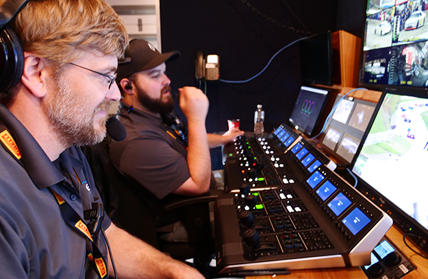 4 M/Eは、レース中に異なる送信先に対するフィードを扱う上で、柔軟性に極めて優れています。通常、番組制作では、テレビネットワークに送られるメインのフィードがあり、それと同時に近くの大型スクリーンやテレビに送信されるスクリーン用のフィードがあります。