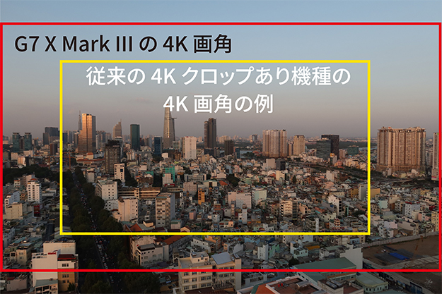 PowerShot G7 X Mark IIIは、1.0型・有効画素数約2010万画素(総画素数は約2090万画素)の積層型CMOSセンサーを採用。映像エンジンDIGIC 8との組み合わせにより、動画と高速連写の性能が向上しているという。同社のコンパクトデジタルカメラで初めてクロップのない4K動画撮影を実現。4Kで撮影した動画は、カメラの操作で静止画として切り出し可能。