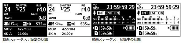 カメラボディ天面には、1.8型の大型モノクロステータスLCDを搭載。静止画・動画用のステータス表示が可能。動画用ステータス表示では、記録フレームレート、シャッタースピード、絞り値、ホワイトバランス、ISO感度、撮影モードや動画記録モードなどの各種設定ステータスと、タイムコード、録音レベル、動画記録時間などリアルタイムに変化するステータスを切換えて表示することができる。ステータス液晶の色はブラックとホワイトから選択可能。電源OFF時でも、バッテリー残量や記録可能時間の表示が可能だ。