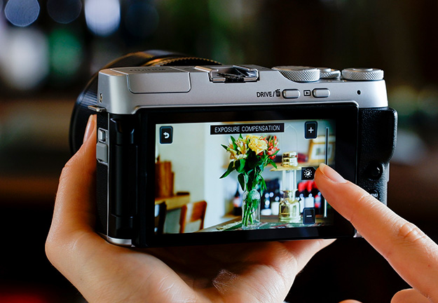 3.5インチ・縦横比16:9の大型ワイド背面液晶モニターを搭載し、快適な撮影をサポートする「タッチメニュー」を採用。明るさやボケ味、フィルムシミュレーションの効果、アスペクト比などを確認しつつ、タッチ操作で簡単に撮影設定を調整可能。最高輝度1000カンデラの明るさを持つ背面液晶モニターにより、高い視認性を実現。