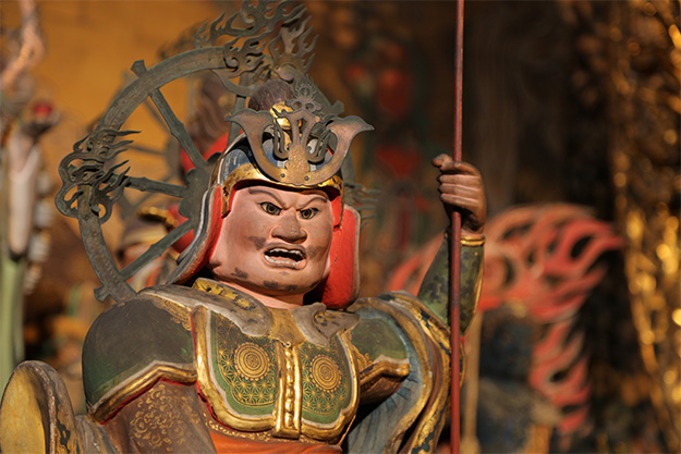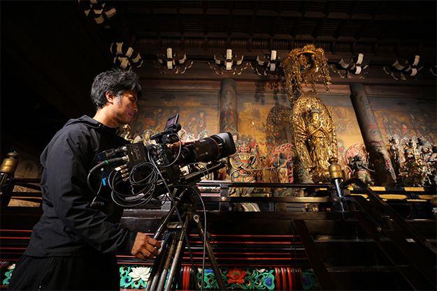 仁和寺の観音堂の内部です。映像が高精細になればなるほど細部の表現力がアップするので、本尊千手観音菩薩をはじめ、立ち並ぶ三十三体の仏像のディテールを忠実に、奥行き感をもって描けたと思います。また壁面など堂内に描かれた障壁画も細かいところまで記録できました。今回は地上波なのでフルHDに変換しての放送となりますが、それでも8K撮影の精細感や立体感は感じられるのではと思います。![]()
