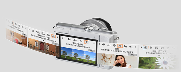 本体サイズは幅約108.2mm×高さ約67.1mm×奥行約35.1mm、質量約299g(バッテリーおよびカードを含む)の小型・軽量ボディー。また、撮影モードの効果が写真やイラストで表示される「ビジュアルガイド」を搭載。上方向に約180°回転するチルト式液晶モニターの採用により、自分の姿をリアルタイムで確認しながら、背景のぼかし具合や美肌効果などを調整して撮影可能。さらに、撮影開始までの秒数が液晶モニターに表示される「動画セルフタイマー」に加え、液晶モニターへのタッチ操作のみで動画撮影が可能なアイコン表示などにより、自撮り動画も簡単に撮影できるという。