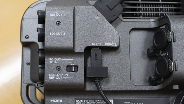 大石氏:あとは、出力のインターフェイスも充実しております。SDIが2つあり、片方は12G-SDIに対応しております。4K60Pの映像が、ケーブル1本で出せるようになりました。加えて、TCとGen-lockのインターフェイスは、FS7では拡張ユニットをつけないと使えなかったのですが、FX9ではカメラ本体に搭載しました。