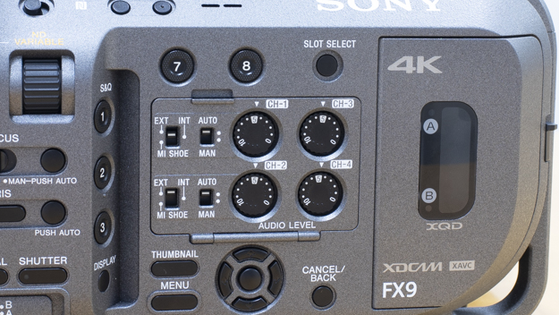 起動時間は、FS7 IIでは約10秒かかっていましたが、FX9では2~3秒に短縮しています。ニュースやドキュメンタリーなどで使用される場合に、早く起動したいお客様には、使いやすくなったかと思います。FS7シリーズでは、INPUT LEVELダイヤルはCH1とCH2だけでしたが、FX9では物理的なスイッチを4チャンネル分搭載しており、触れて操作できます。