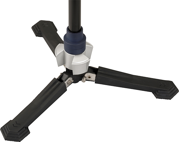 ミニ三脚部に搭載された独自機構のフットペダルを足で踏むことで、一脚固定のON/OFFが切り替え可能。埃や異物の混入を防ぐ内蔵型ボールジョイントにより、 スムーズな回転動作を実現。また、側面のボタンを押すことにより、ワンタッチでミニ三脚を折り畳むことができる。最後まで開脚するとロックが掛かる。