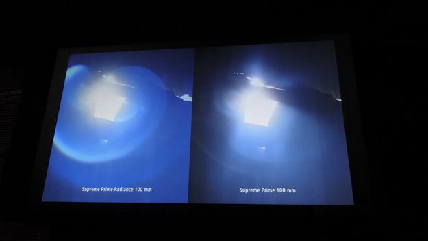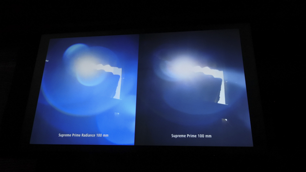 Supreme Prime、Radiance、アンコートレンズの比較例を見ると、Supreme Primeは非常にコントラストがあり、画のメリハリが高い。中央のRadianceは、中央にレンズ構成をそのまま見せる円形状のフレアがブルーで出ている。ただフレアが出ているけれども、画面四隅のコントラストは落ちていない。ノンコートはすでに白っぽくなっているので、例えば役者が端のほうにいったときに表情がわからなくなると紹介した。