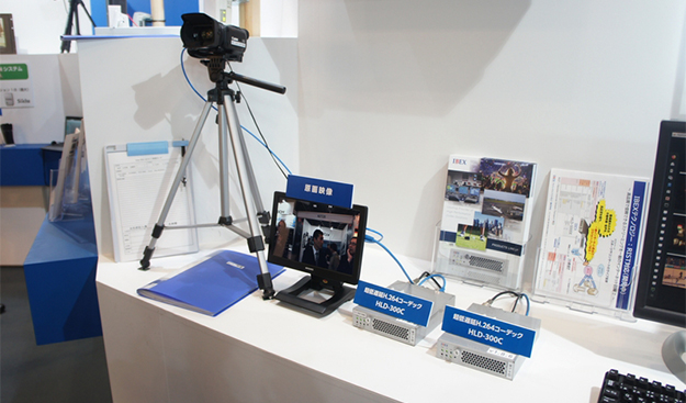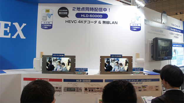 今回は、新製品として4K対応HEVCコーデック搭載のエンコーダー/デコーダーHLD-5000E/HLD-5000Dを始め、既発売の超低遅延対応H.264コーデック搭載のエンコーダーデコーダーHLD-300C、Cloud向けソリューションとしてIntel PAC Stratix 10によるH.264 11ch同時デコードなどを出展。また、60GHz帯無線装置MultiHaulとHLD-5000を組み合わせた4K映像の伝送実演を披露した。