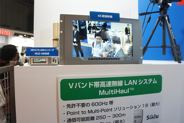 60GHz帯無線装置MultiHaulとHLD-5000を組み合わせた4K映像の伝送実演。トータルで30msecの超低遅延伝送が可能