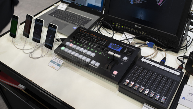 V-60HDは、Vシリーズなのでスイッチャーのみだが、プリアンプ搭載のオーディオミキサーを搭載。こちらも配信で使われることが多いという。ブースではV-60HDも配信システムとプロダクション寄りの2パターンの展示が行われていた。ちなみに、V-60HDもPTZカメラに対応している。