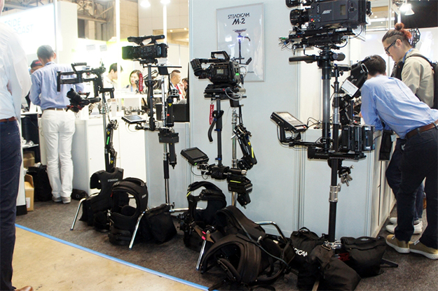 銀一は新製品のSteadicamM2を日本初展示したほか、今年からディストリビューションを開始したTransvideoの液晶モニター、AATON Digitalのレコーダーなどを出展。また、先日発売開始したRODE Microphonesの超小型ワイヤレス送受信機Wireless GOをはじめ、マイクやマイクアクセサリーのほか、アスクの協力により、Bluetooth経由でデバイスに同期させることができるTimecod Systems社の新製品を展示。