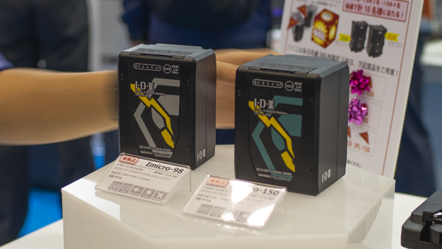 今年のアイ・ディー・エクスブースは、バッテリー、ワイヤレス、モニターなどの新製品が多数展示されていた。バッテリーの新製品は、Vマウントマイクロタイプリチウムイオンバッテリーの「Imicro-150」「Imicro-98」だ。小型サイズで、最大出力154W(14A 11V時)と高いパフォーマンスを持つバッテリー。2つのD-Tap、V-Torchを搭載。アクセサリーのマイクロ2連ホットスワップアダプター「A-Vmicro2」を使うことにより、ホットスワップ機能にも対応する。