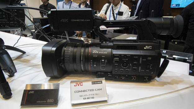 さらに、最近の新しい動きとして、放送用カメラでもSSDメディアアダプターを使用することでSSDメモリーにの4K60P記録が可能なJVCケンウッドのGY-HC550/500を展示。汎用のM.2のSATAのSSDをアダプターに入れてカメラ本体のスロットの形で入れることで、4K60PのProRes 422 HQ記録に対応する。