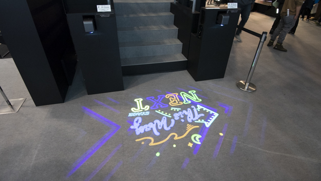 これまでのプロジェクターは、シフト範囲に制限があるため設置に制限があり、大胆な投影などが行いにくかった。しかし、Z5000は、広いシフト範囲と超短焦点の特性を活かして、地面や天井に映像の投影を実現しやすいプロジェクターとなっている。ブースでも随所に、思わぬところに映像が投影されて、目を引いた。