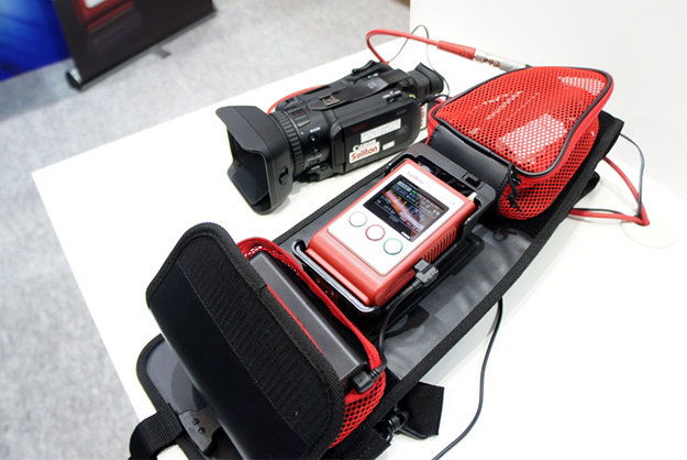 Smart-telecaster Zao-Sは約350gとコンパクトな手サイズながらHD-SDIとHDMI両方の入力に対応し、モバイル回線を3回線束ねることが可能。写真のような専用バッグが標準添付されており、接続するモデムや専用バッテリーを収納できる。内蔵バッテリーで約60分、外部バッテリーを使用することでさらに長時間の稼働が可能