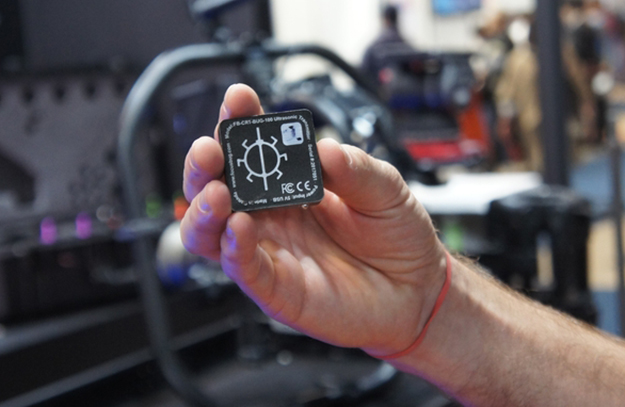 フォーカスターゲット。約4×4cmほどのおおきさで、衣服の下にセットすることも可能。最大4台のトランスミッターを約36mの距離まで追跡可能