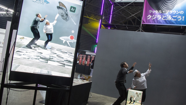 展示会場では、Photoshopの技法を広めている伝道師ラッセル・ブラウン氏によるテーマ展示「クジラと泳ごう!」が行われていた。iPadやiPhoneのARアプリを通して見ることで、泳ぐクジラが合成されるというもの。Aeroの機能をフルに使ったコンテンツだ。