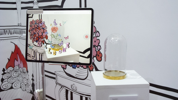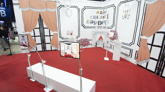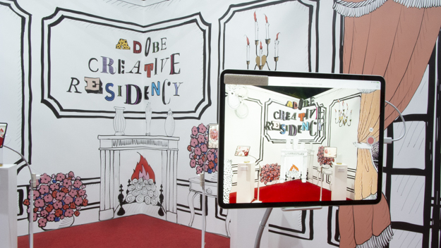 Adobe Creative Residencyのコーナーには、中田拓馬氏と福田愛子氏によるARコンテンツ「The Wonder Chamber ~不思議の部屋~」を展示。福田氏がコンセプトや家具の選定などアートディレクターとイラストレーションを担当し、中田氏が福田氏の描き出す世界感をARコンテンツで再現。イラストとテクノロジーの表現の可能性を目指したものだという。iPadのARアプリを通して見ることで、ガラスドームの中の薔薇が浮いたり、文字を触ると飛び跳ねる様子を楽しめるようになっていた。