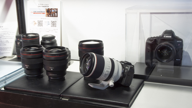 EOS RやEOS RPを展示。特に注目はRFレンズの個性的なレンズ。RF70-200mmの全長が短いのにはびっくりだ