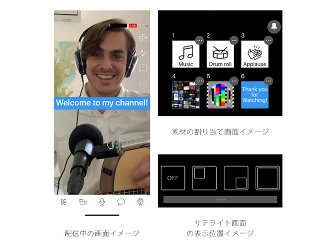 専用アプリには、拍手や笑い声のほかにもコミカルな効果音、幅広い場面で使えるBGMや静止画、動画サンプルが内蔵されており、すぐに使うことができる。ユーザー自身がスマートフォンに保存した動画や写真、音楽の使用も可能。テロップを挿入する際には、文字や色を自分で設定でき、雰囲気づくりにこだわった演出が行える。また、顔の映りをよくする「美肌フィルター」などの、便利な機能を搭載。無線接続した2台のスマートフォンのカメラ映像を使って、アングルを切り替えたり、2つの画面を重ねたりすることもできる。さらに、視聴者からのコメントをアプリの画面上に表示して、配信中にリアルタイムのコミュニケーションを楽しむこともできるという。