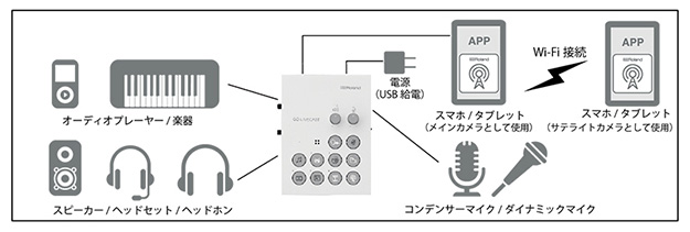 また、内蔵マイクのほかに48Vファンタム電源対応のマイク端子を装備。コンデンサー・マイクを接続して、高音質のトークや歌を配信できる。ヘッドセット・マイクの接続も可能で、マイクの位置を気にせず配信が行える。LINE IN端子にはシンセサイザーなどの楽器を接続し、演奏を高音質で配信できるとしている。