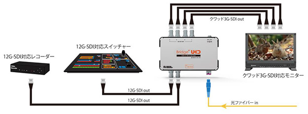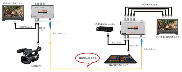 UHD_SOTは光延長器としてだけではなく、12G-SDIからクワッド3G-SDI(クワッド3G-SDIは2SIのみ対応。SQD非対応)への変換器としても使用可能。ディップスイッチで光への変換とクワッド3G-SDIへの変換を切り替える。また、12G-SDIのループ出力端子を搭載。光延長、もしくはクアッド3G-SDIに変換している映像信号と同時に出力が可能なため、離れた場所で同じ4K映像を同時に確認可能。