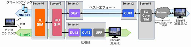 図3は、提案したコンセプトの実証例。端末側から配信する4Kのビデオ映像を、一つの無線装置から超低遅延スライスとインターネットに向けて同時に配信できることを確認した。大規模イベント会場で来場者向けにリアルタイム映像を配信しながら、同じ映像をインターネット経由でも配信するようなサービスが提供可能となる。