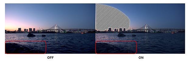 低輝度領域の再現を重視したブラックディテール表示機能により、バックライトの輝度を三段階で下げることで低輝度領域の正しい色と階調を再現。月明かりや暗闇など、全体の輝度が低い映像において、画面全体を一定の輝度に抑えながら、信号レベルを調整し、低輝度領域の色と階調を忠実に再現するとしている。モニターのダイナミックレンジを上回る高輝度領域は、クリップもしくはゼブラパターンで表示する。