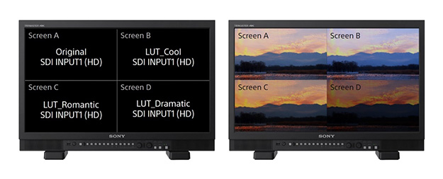 Quad Viewモードでオリジナル映像と3種類のLUT適用比較