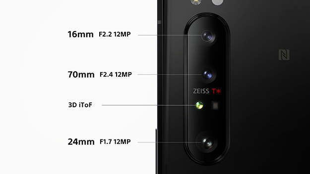 メインカメラにはZEISSレンズを新たに採用。階調、色再現、透明感、立体感、ぼけ味など、被写体の微細な質感までを忠実に再現する。さらに、T*コーティングにより、画質低下の原因ともなるフレアやゴーストを最小限に抑え、クリアな描写を実現。また、有効画素数約1220万画素のイメージセンサーを採用した、焦点距離24mmの標準レンズ(F1.7)、70mmの望遠レンズ(F2.4)、16mmの超広角レンズ(F2.2)(35mm換算)と、3D iToFセンサーを搭載。さらに、標準レンズと超広角レンズのセンサーにはデュアルフォトダイオードを搭載し、あらゆるシーンで最速0.03秒の高速AFが可能だという。