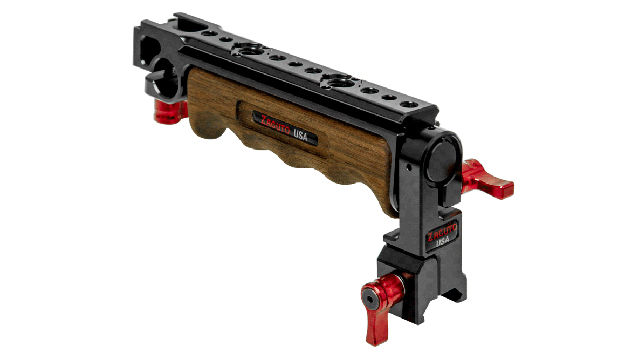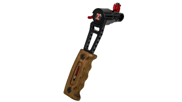 トリガーグリップ15mm Rodは木製のグリップで左右選択して使用。15mmロッドに取り付け、スムーズに撮影が可能。根元のレバーを押すことで360°回転する。