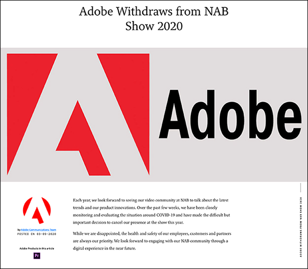 アドビは、2020年4月18日~4月22日(展示会は19日から)に米国ラスベガスで開催されるNAB2020への出展中止を発表した。新型コロナウイルスのリスクを懸念した判断となった。