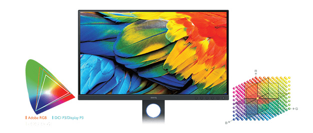 Adobe RGB99%、Display P3/DCI P3 95%、sRGB/Rec.709を100%カバーすることで正確な色再現を実現し、ムラ補正技術により輝度と色の均一表示が可能。また、キャリブレーション時間は従来モデルより大幅に短縮。スムーズなグラデーション表示を可能にする10bitパネルおよび3D 16bit LUT(ルックアップテーブル)を採用し、4K UHD(3840×2160)の高解像度でグラフィック、動画、写真などを細部まで美しく表示し、信頼できる色による作業環境を提供するとしている。