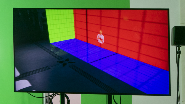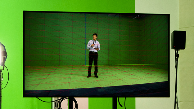 例えば、会場のデモを観てみると、床に微妙な影が発生している。これらの影は、Cyclorama(サイクロラマ )と呼ばれる機能によって3次元的にグリーンバックの形状を定義し、実際のカメラ入力からの映像をテクスチャとして貼り付けていることによって可能となるものだ。