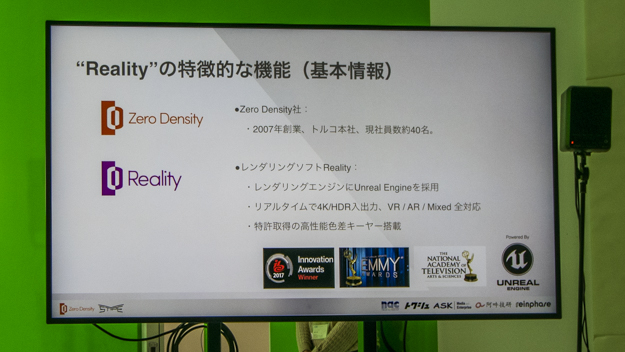 Zero Densityが開発しているリアルタイムレンダリングソフトの製品名が「Reality」で、レンダリングエンジンはリアルタイムにフォトリアルなレンダリングが可能なUnreal Engineを使用している。4K HDRの入出力に対応しており、VR、AR、その両方を合わせたMRでの世界観の表現を特長としている。
