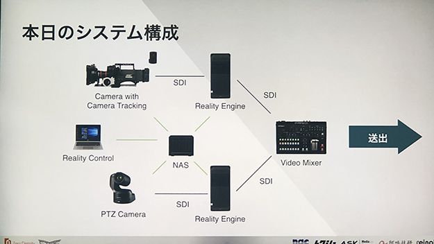 CGのレンダラーは、Reality Engine。ワークステーションはHP Z4 G4 Workstation。GPUはQuadro RTX 6000を搭載。HD-SDIの入出力には、AJAのCorvid 44 12G。1カメにつき1レンダリングエンジンが必要で、今回は2カメなので2つのワークステーションを導入している。その中間にはNASがあり、ここに共通のコンテンツが入っている。その共通のコンテンツをAカメの位置からの視点と、Bカメの位置からの視点それぞれでレンダリングをしている。