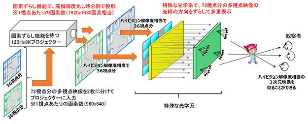 今回開発したシステムでは、72視点分の多視点映像を用いている。また、画素ずらし機能を持つ8Kプロジェクターで、この多視点映像を高解像度化する。さらに、特殊な光学系を用いて、高解像度化された72視点分の多視点映像の光線の方向をずらして多重表示することで、これまでNHKが開発してきた約30万画素の3次元映像表示システムから、ハイビジョン解像度相当の高精細化を実現。