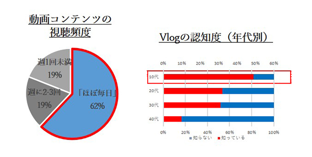 そんな中「Vlog」に関する認知度は全体では31%で、年代別で見てみると、10代での認知度は約半数の49%、20代で32%、30代では31%、40代では10%と年代によって顕著な差が生まれた。この結果から、デジタルネイティブによるSNSブームの取り込み速度の速さが伺える。