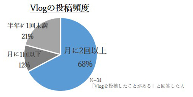 実際に「Vlogを投稿したことがある」人の中で、月に2回以上投稿している人は68%。性別で見ると、週に2・3回以上と答えた人の数は、女性の33%に対し、男性は約2倍となる64%。おしゃれで凝った編集を行いたい女性に比べ、男性はリアルタイムで“撮って出し”が多いのかもしれない。
