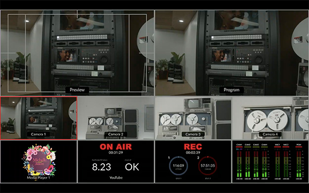 ATEM Mini Proはプロ仕様のマルチビューを搭載しており、4つすべてのビデオ入力に加え、プレビューとプログラムを1台のHDMIテレビやモニターで確認できる。各カメラのビューには、オンエア状態が確認できるタリーインジケーターが表示される。また、各ビューのラベルはカスタマイズ可能で、それぞれのオーディオメーターも表示。メディアプレーヤーも表示されるため、選択されているグラフィックを確認可能。さらに、マルチビューは、収録、配信、Fairlightオーディオミキサーのステータスも表示する。