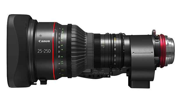キヤノンがNAB2020で発表予定だったのは、8Kカメラに対応する光学性能と高倍率の10倍ズームを実現し、1.5倍のエクステンダーをレンズ本体に内蔵したEFシネマレンズ「CINE-SERVOレンズ」シリーズの新製品だ。大きな特長は3つ。1つ目は、特殊低分散ガラスを用いたレンズや大口径非球面レンズを採用し、それらを最適配置する独自の光学設計技術により、色にじみや色収差を良好に補正し、8Kカメラに対応する光学性能。2つ目はスーパー35mm相当サイズの大判センサーを搭載したカメラに対応するレンズとして、焦点距離25-250mmをカバーする10倍ズームの実現。内蔵エクステンダー使用時は、ズーム域を焦点距離37.5-375mmに切り替えられるほか、35mmフルサイズセンサーに対応するレンズとして使用することもできる。3つ目は、肩担ぎが可能な軽量設計に加え、放送用レンズ同様の操作性を実現する着脱可能なドライブユニットの標準装備。ドライブユニットを取り外すことによりマニュアル操作にも対応する。
