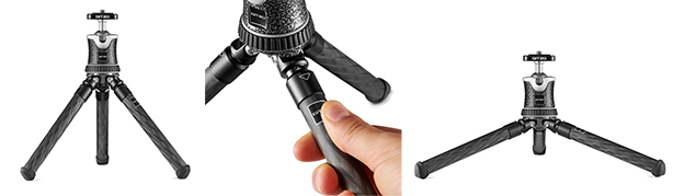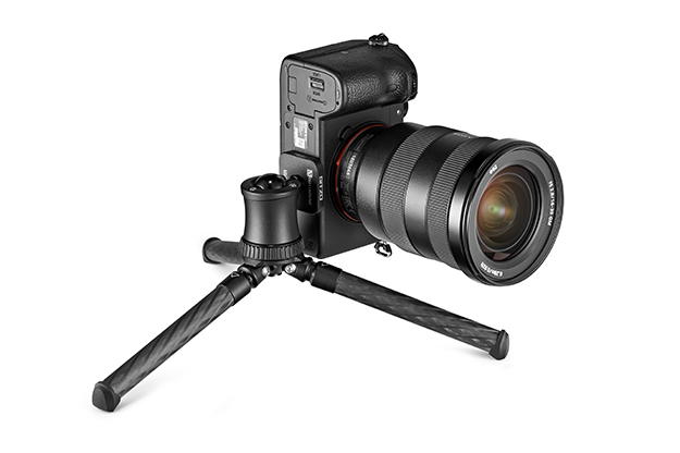 脚チューブは剛性に優れたCarbon eXact、雲台は比強度に優れたアルミニウム合金を採用しており、最大3kgの耐荷重性能を備えている。また、新開発の“Pull & Fix”開脚角度セレクター(特許申請中)は脚を引き下げることで開脚角度の切替ができる(2段階)。