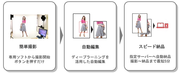 近年、ECサイトのプロモーションやショッピングセンターの新たな集客施策の1つとして動画を活用するケースが増えており、特にファッションECサイトにおいては動画活用のニーズが急速に高まっている。同ソリューションは、動画撮影システムと自動編集を行うクラウドサービスが一体となっており、動画撮影専門のスタッフでなくても簡単に動画コンテンツの撮影から編集まで行うことが可能となり、オペレーションの効率化やコスト削減を実現するとしている。