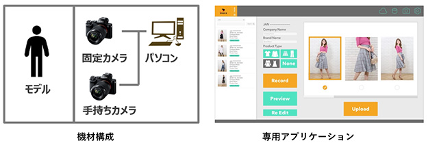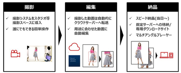 撮影システムは撮影スタジオなどに常設し、撮影は専用アプリケーションをインストールしたパソコンを操作することで簡単に行える。また、撮影した動画は、ソニーのディープラーニング技術「Neural Network Libraries」を活用して開発したアルゴリズムによって解析後、専用クラウドサーバーへ転送されて用途に合わせた動画コンテンツに自動編集される。