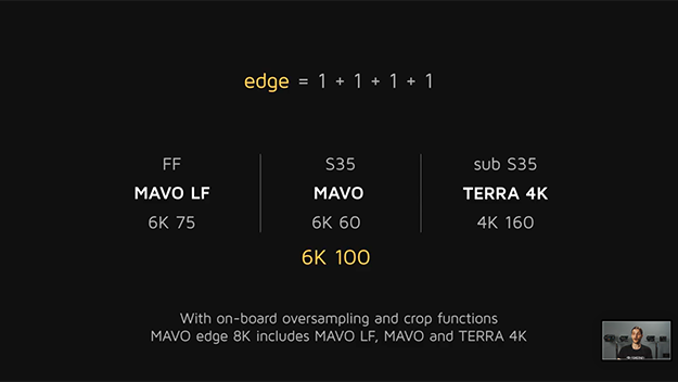 MAVO Edgeの8Kイメージセンサーは、ISO800とISO3200のデュアルネイティブISO、8Kワイドで最大75fps、最大14+stopを備えている。サイズは36x24mmフルフレームCMOSセンサーで、4500万ピクセルを実現している。