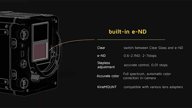 Kinefinityは、初めて電動「FS e-ND」システムをカメラ内部に搭載。クリアガラスとe-NDフィルターの切り替えは、電動化されている。e-NDフィルターは、2ストップから7ストップまでの広い範囲を連続調整でカバーできる。同時に、調整範囲全体にわたって一貫した色の精度と鮮明さを実現している。MAVO EDGEの主な特徴は以下の通り。