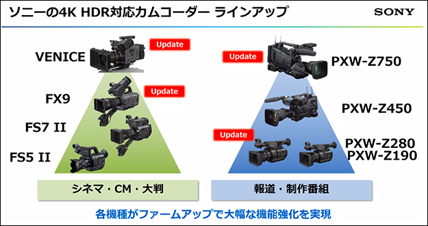 以上が、カメラやポストプロダクション関連のアップデートとなる。ここまでのアップデートの中でも特に印象的なのはHDR-SDR同時制作アシスト機能だろう。中継などのジャンルでHDR-SDR同時制作を先行してきたソニーだからこそ、その技術を他のジャンルでも転用しつつあるようだ。
