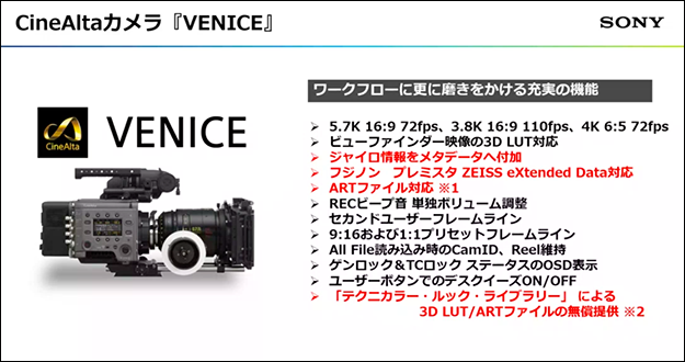 具体的には、カメラの中に実は搭載されていたジャイロ情報をメタデータに付加したり、フジノンのラージフォーマットセンサーに対応したPremistaで、ZEISS eXtended Dataを収録に対応する。加えて、モニターの出力として3D LUTを使用できたが、ハイクオリティな画が出るARTファイルの対応も実現する。