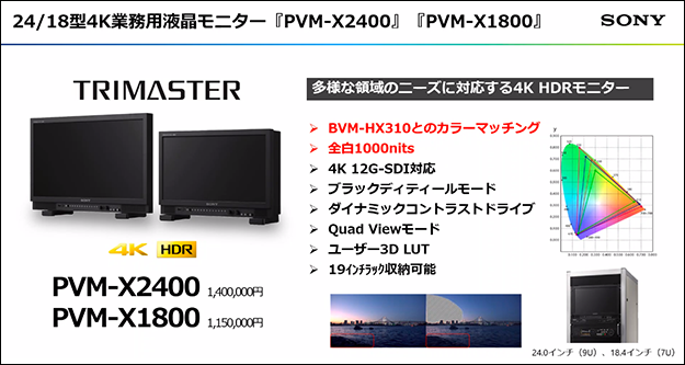 「PVM-X2400」と「PVM-1800」は、今年夏に発売予定の24型と18型の4K業務用液晶モニターだ。両機種とも特徴はすでに発表の通り、マスターモニターであるBVM-HX310とのカラーマッチングや全白時1,000nitsが可能でありながら値段の面でもコストパフォーマンスの高さを特徴とする。