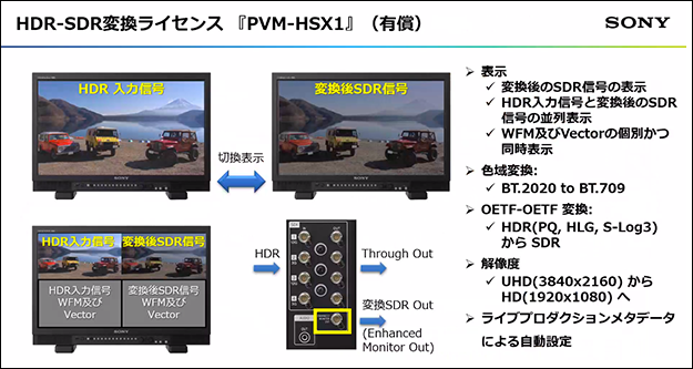 その2機種に対応するHDR-SDRの変換ライセンス「PVM-HSX1」が現在、有償機能として現在開発中であることが明かされた。HDR-SDR同時制作の現場では、両者を比較をしたいというニーズが強く、ポスプロで変換したり、変換器を購入して間に噛ませることで実現をしている。PVM-HSX1を使えば、HDR入力信号を入力してモニター側の設定を変えるだけで、変換後のSDR信号を確認できる。また、HDR入力信号と変換後のSDR信号の並列表示も可能になる。