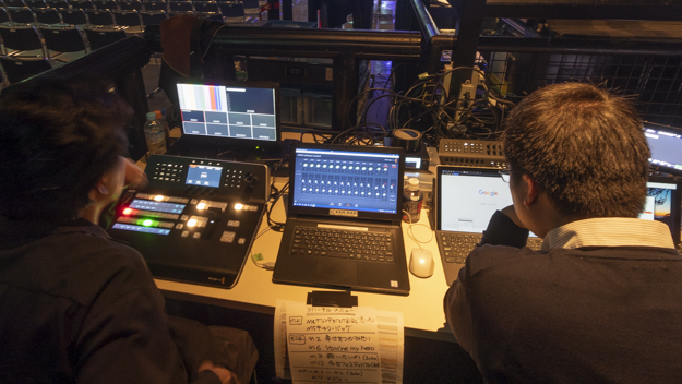 しかも、本公演は本格的なライブ配信の機材構成で撮影、収録が行われた。「ライブは無料だが現場は凄いですよ。映像配信で実績の多い人材をかき集めて最高の機材を使ってやっていますから」とカメラ担当の渡邊聡氏は語る。技術統括の金森郁東氏も「オーバースペックで先端技術の無駄遣いですよ。これは」と笑って答えた。